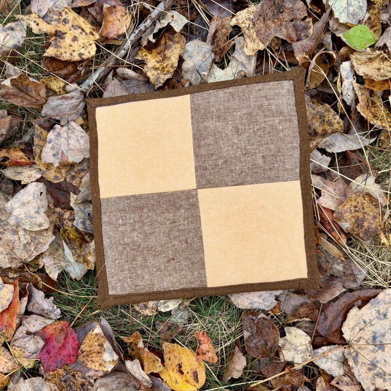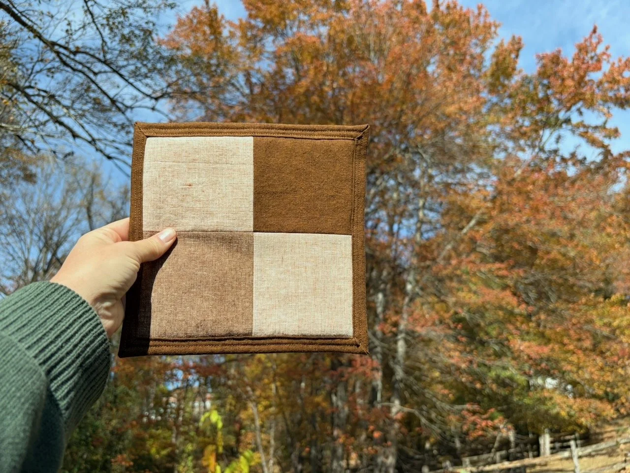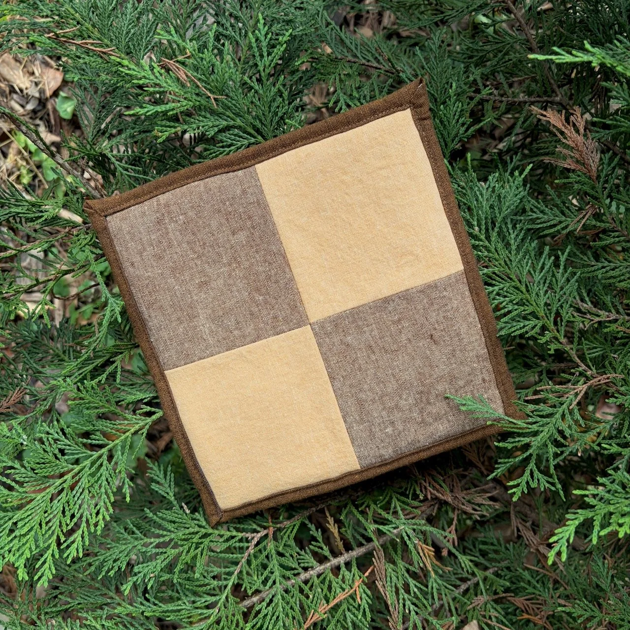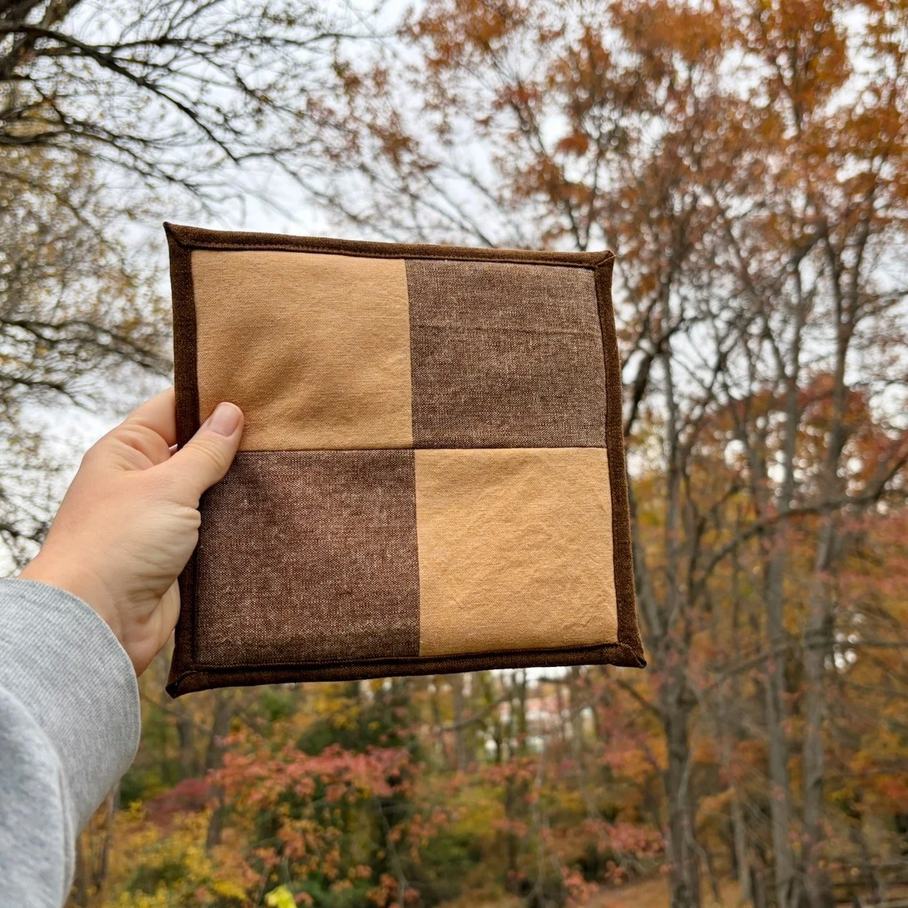 This quilted trivet brings an earthy, layered aesthetic to your table, featuring a rich botanical print surrounded by soft green-gray and rich brown.